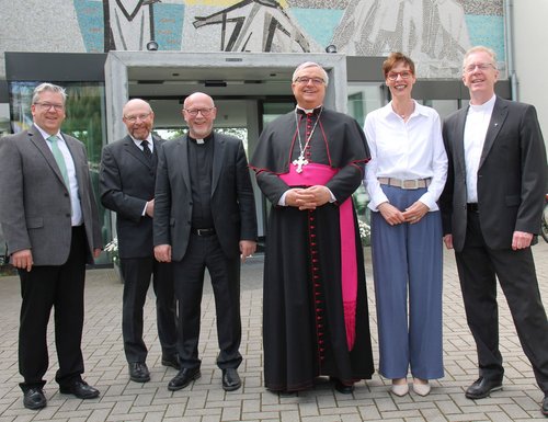 Vor dem Pastoral- und Priesterseminar (v.l.n.r.): Patrick Stöbener, Matthias Zech, Generalvikar Markus Magin, Bischof Karl-Heinz Wiesemann, Seminarrektorin Tatjana Blumenstein und Regens Franz Vogelgesang.