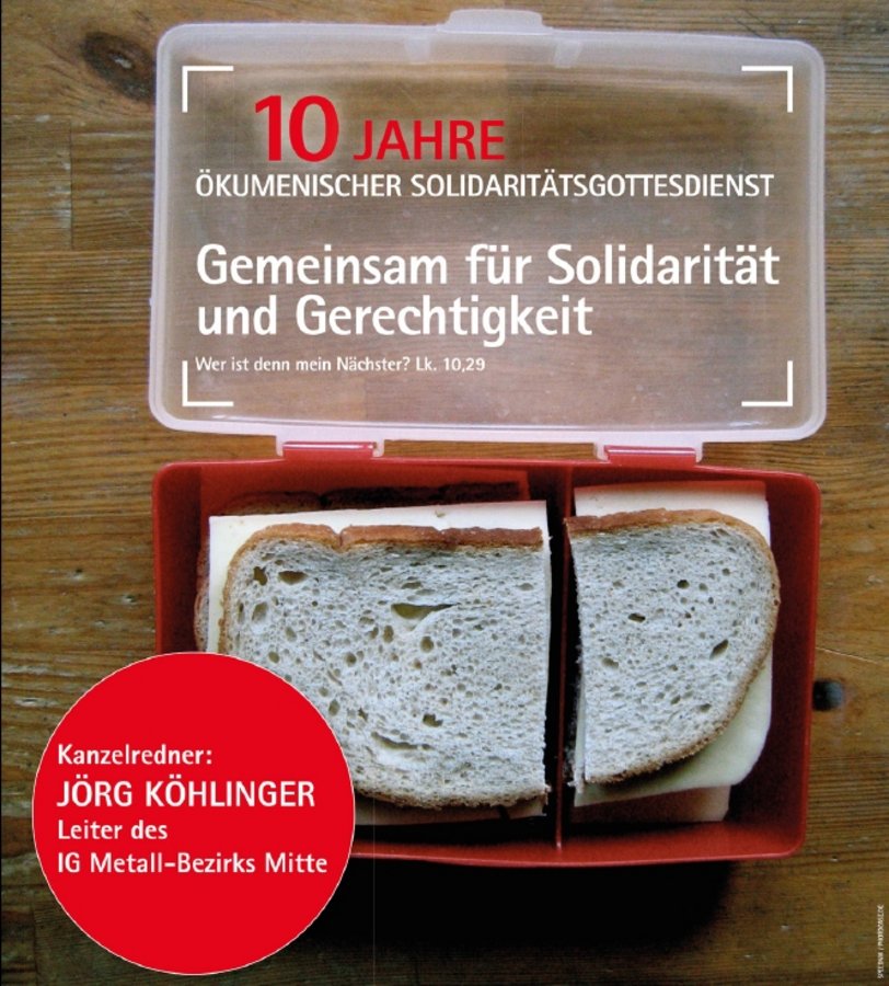 Im Jubiläumsjahr wird die Frage „Wer ist mein Nächster?“, ein Bibelvers aus dem Gleichnis vom barmherzigen Samariter, im Mittelpunkt des Gottesdienstes stehen. Als Kanzelredner wird Jörg Köhlinger, Leiter des IG-Metall-Bezirks Mitte, die Frage danach stellen, welche Menschen in unserer Gesellschaft besonders auf Solidarität und Gerechtigkeit angewiesen sind und welchen Beitrag Kirche, Gewerkschaft und Gesellschaft dazu leisten können.